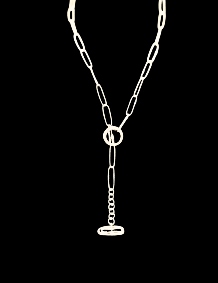 The picture shows a one-of-a-kind modern, minimalist lariat design featuring elongated sterling-silver links and a sleek circle-and-bar focal point. The open loop allows the polished pole pendant to glide through effortlessly, creating an elegant drop that moves with you.